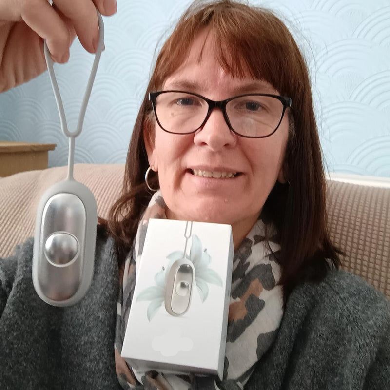Houd Calmarry in de palm van uw hand met de metalen kant naar beneden. Het apparaat wordt ingeschakeld door de knop aan de zijkant lang ingedrukt te houden en start automatisch in de langzame pulsmodus. U kunt nogmaals op de knop drukken om over te schakelen naar de snelle pulsmodus en de intensiteit aan te passen met de knoppen ‘+’ of ‘–’. Elke sessie duurt 20 minuten en wordt automatisch uitgeschakeld.